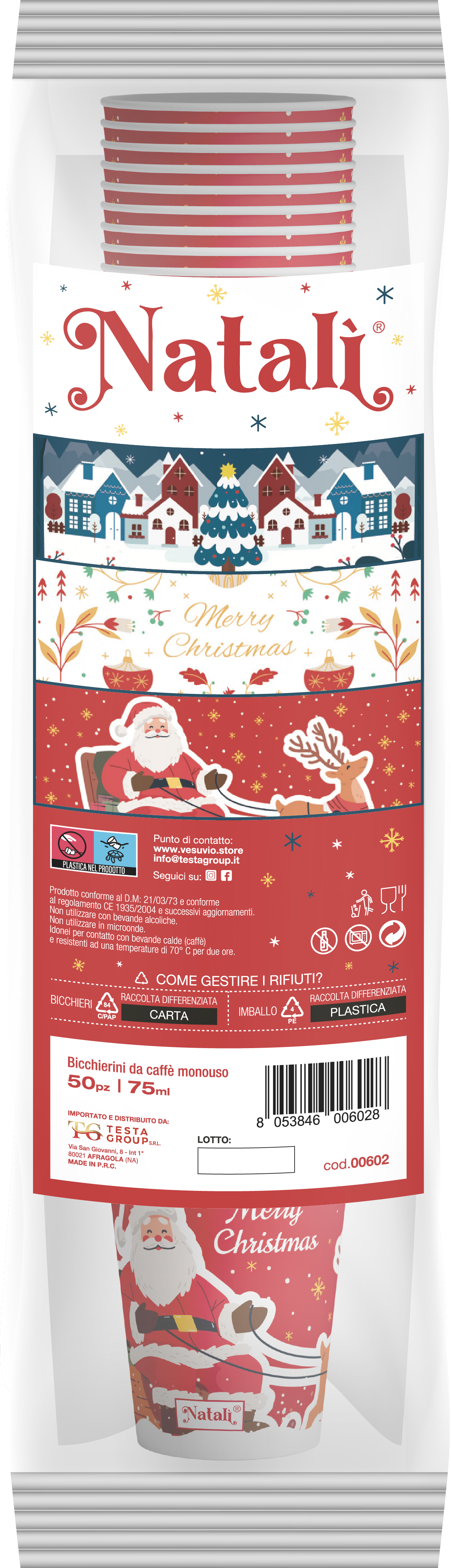Aggiungi un tocco di festa al momento del caffè! I bicchierini monouso Natalì® con design Babbo Natale uniscono praticità e spirito natalizio. Perfetti per servire il caffè con allegria durante pranzi, cene o pause natalizie.