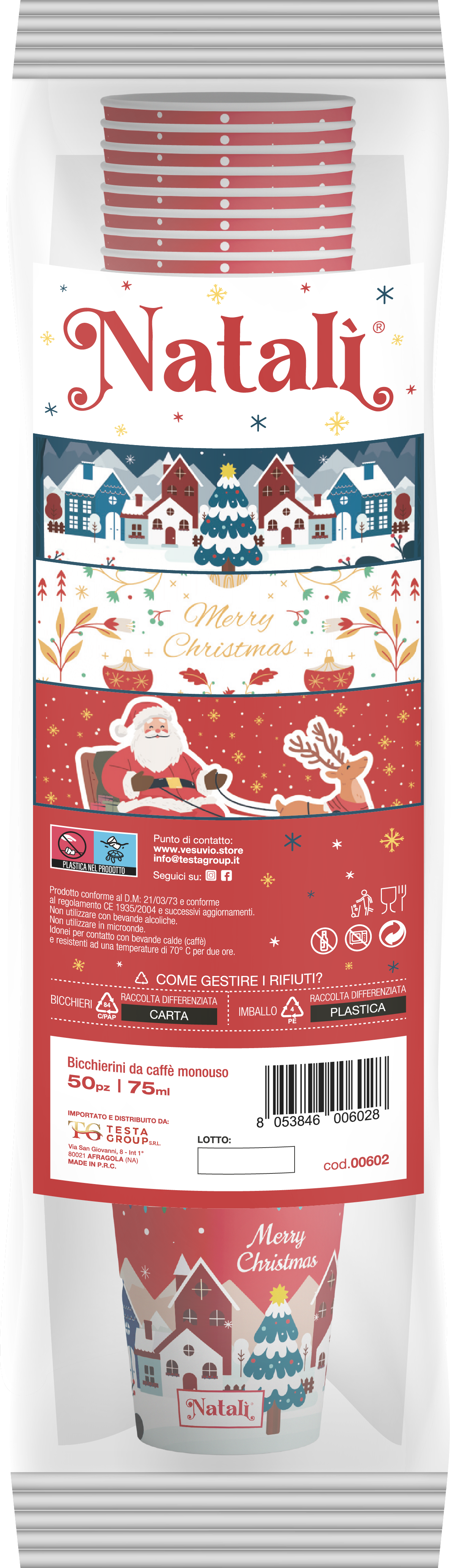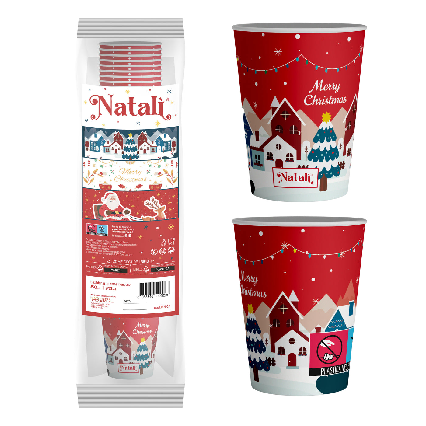 Aggiungi un tocco di festa al momento del caffè! I bicchierini monouso Natalì® con design Paesaggio Natalizio uniscono praticità e spirito natalizio. Perfetti per servire il caffè con allegria durante pranzi, cene o pause natalizie.