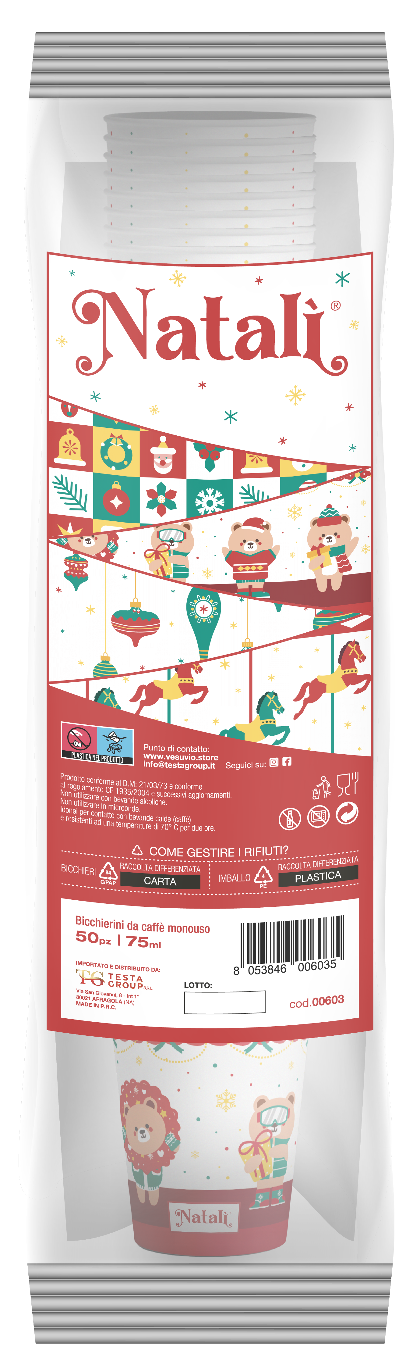Aggiungi un tocco di festa al momento del caffè! I bicchierini monouso Natalì® con design Orsetti uniscono praticità e spirito natalizio. Perfetti per servire il caffè con allegria durante pranzi, cene o pause natalizie.